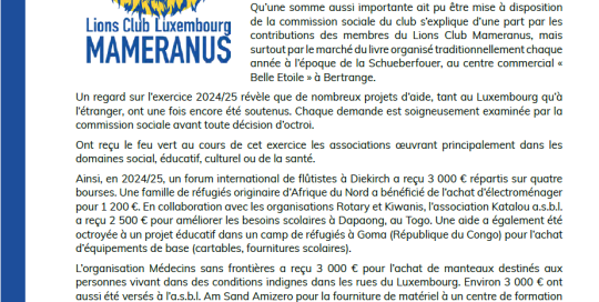 EDITION 2025 DU BIchermaart COURONNÉe À NOUVEAU d’UN GRAND SUCCÈs Le Lions Club Mameranus a organisé, du 28 août au 1er septembre 2025, son traditionnel Bichermaart au centre commercial Belle Étoile à Bertrange, dans le cadre de la braderie de la Ville de Luxembourg. Créé en 1991, ce marché de livres d’occasion est devenu au [...]