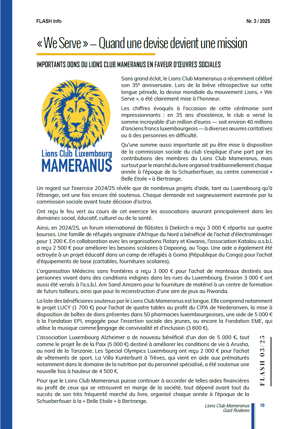 EDITION 2025 DU BIchermaart COURONNÉe À NOUVEAU d’UN GRAND SUCCÈs Le Lions Club Mameranus a organisé, du 28 août au 1er septembre 2025, son traditionnel Bichermaart au centre commercial Belle Étoile à Bertrange, dans le cadre de la braderie de la Ville de Luxembourg. Créé en 1991, ce marché de livres d’occasion est devenu au [...]