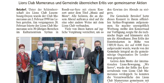 christophe2021-02-11T10:22:25+00:00En 2020 le Lions Club Mameranus fête son 30ème anniversaire. Le Lions Club Mameranus a commémoré son 30ème anniversaire par un concert le 28 février 2020 au Centre Culturel Syrkus à Roodt-sur-Syre. Sous le titre « Music and More » la première partie de ce concert était consacrée à la musique de Georg Philipp [...]