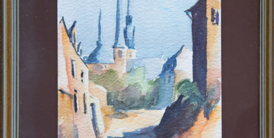 Peter Admin2021-04-02T06:37:08+00:00Vue de Luxembourg-Ville, cathédrale, aquarelle 1974, 31 x 24 cm, par Mars SCHMIT, 1931 – 2000, professeur éducation artistique, auteur du bronze « nikolaus Mameranus » à Mamer, (la photo rend mal les beaux coloris) 200.-€