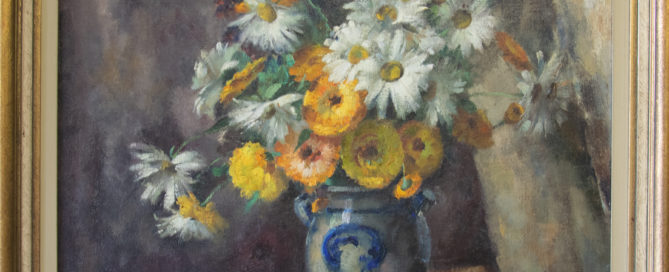 Fleurs, huile sur toile, 72 x 80, signé en bas à droite Josy Meyers, 1902 – 1970, peintre luxembourgeois, professeur d’éducation artistique, prix grand-duc adolphe 1927, état parfait 1 200.- €